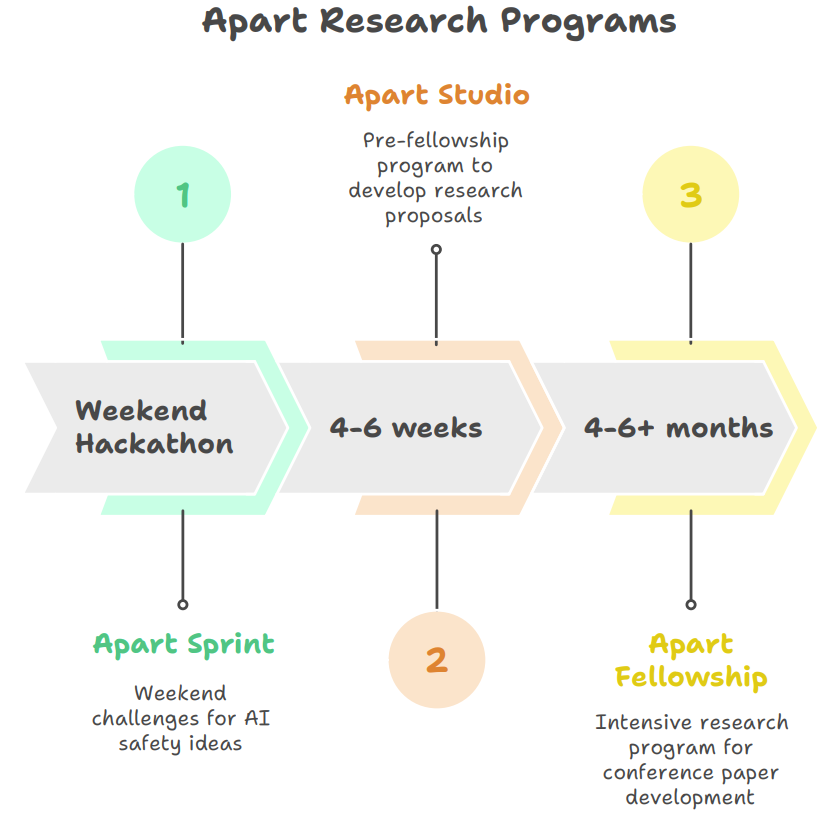 Apart Research identifies experienced technical talent globally through accessible weekend research hackathons, then provides structured research experience and mentorship through increasingly selective programs (Sprint(Hackathon) → Studio → Fellowship) that produce peer-reviewed publications preparing top participants for AI safety careers. Our alumni have published their research at top venues and transitioned to AI Safety roles, **contributing technical diversity and research to the field**.